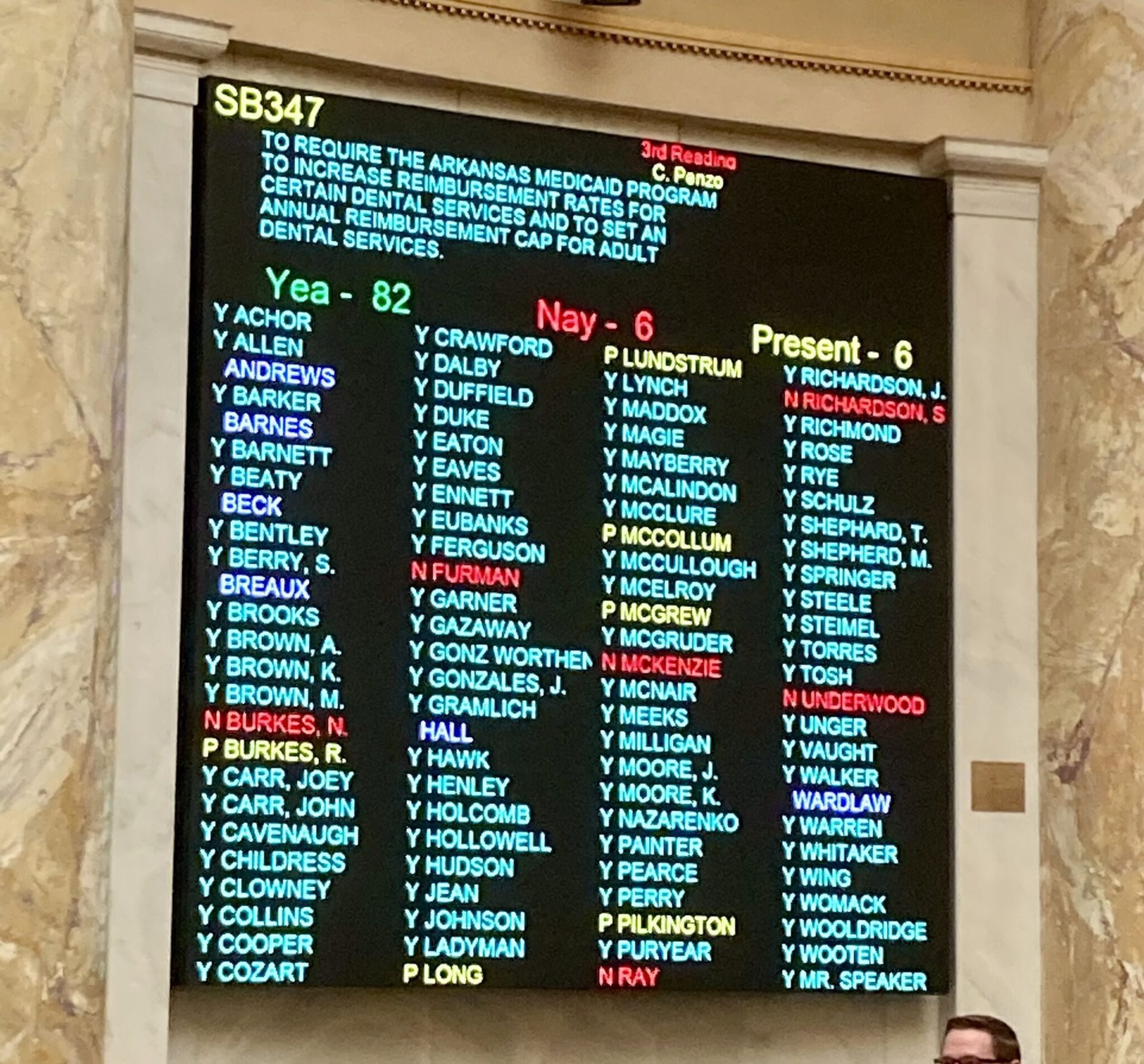 The effectiveness of organized dentistry was abundantly apparent as SB347 finally passed the House of Representatives by a vote of 82-6! And the addition of the Governor’s signature on April 22 was the icing on the cake. We appreciate the good work of Rep. Julie Mayberry, Sen. Clint Penzo and the legislative leadership for shepherding this important legislation through the process! As you may have heard before, “Everything in life is about relationships.” Now that the 95th General Assembly has adjourned, it’s important to know that may, many relationships were at the core of the passage of SB347. Without those relationships, this would not have happened. To that end, ASDA encourages its members to develop a relationship with their House and Senate representatives. The 95 th Arkansas General Assembly is in recess until next week, but it has not adjourned sine die. Although this session will be remembered as one of the most frenetic sessions in recent memory, the result for dentistry in Arkansas was very, very positive. Below is a recap of the bills that ASDA worked during the session. SB347 –Sen. Penzo, Rep. Mayberry – Act 1025 TO REQUIRE THE ARKANSAS MEDICAID PROGRAM TO INCREASE REIMBURSEMENT RATES FOR CERTAIN DENTAL SERVICES AND TO SET AN ANNUAL REIMBURSEMENT CAP FOR ADULT DENTAL SERVICES. – As the centerpiece legislation for ASDA, SB347 was hard fought and much needed to salvage a declining Medicaid dental program. Thanks to the involvement of Arkansas dentists and specialists, the bill passed the Senate 29-4 and the House 82-6. It injects $6.9 million into the Medicaid program as a match to draw down an additional estimated $16 million in federal funding for a total impact of about $23 million. The increased fee schedule is scheduled to take effect September 1, 2025. KUDOS to Dr. Terry Fiddler who has fought the battle with DHS for the past 8 months to bring this much needed fee increase to fruition!. Although it was not ASDA’s initial intent to file legislation for the increase, it became necessary to cast more light on the 18-year old fee schedule and the danger of losing providers. SB111 – Sen. Hammer -Act 395 TO ESTABLISH THE DENTIST AND DENTAL HYGIENIST COMPACT – In a measure promoted by the US Department of Defense and endorsed by the ADA, the DDS/RDH Compact will allow for licensure portability among licensed dentists and hygienists who can practice in other states without securing local licensure, but only in states that participate in the Compact. Providers who violate the practice act in any participating state will be disciplined in the state where the infraction occurred, and stand to lose privileges in all states. HB1241 Rep. Mayberry, Rep. Johnson, Sen. Irvin Act 568 TO ENSURE THAT THE ARKANSAS MEDICAID PROGRAM REIMBURSES FOR DENTAL AND ANESTHESIA COSTS FOR HIGH COMPLEXITY ORAL HEALTH CARE. This act requires that Medicaid pay for dental treatment and anesthesia for high complexity adults provided the services are rendered either at UAMS or the Lyon College School of Dental Medicine. UAMS has expressed interest in restoring these services, and the LCSODM plans to construct four operatories to treat this segment of Arkansas’ population. HB1636 – Rep. Ray et al TO AMEND THE ARKANSAS SOFT DRINK TAX ACT, AS AFFIRMED BY REFERRED ACT 1 OF 1994; AND TO PHASE OUT THE SOFT DRINK TAX BASED ON SALES TAX COLLECTIONS FROM SALES OF SOFT DRINKS. Proponents of the bill stated that the tax puts soft drink manufacturers, grocery stores and retail establishments at a competitive disadvantage especially in border cities, whereas opponents of the measure state that the tax provides a solid base for the Medicaid Trust Fund in lieu of state general revenue. Although the bill aimed to replace the tax revenue with another source of funding, that source was not identified. Without the tax, Medicaid stands to lose about $130 million in funding. The bill carried a $42.5M fiscal impact and was referred as an Interim Study Proposal to be examined prior to the next legislative session. FLUORIDATION BILLS: No fluoridation bills passed during the session. As in previous years, the effort to overturn the Community Water Fluoridation Act of 2011 was either voted down or was not brought to a vote. SB2 –Sen. Penzo, Sen. King, Rep. Duffield, Rep. Pilkington TO REPEAL THE STATEWIDE FLUORIDATION PROGRAM; AND TO REMOVE THE MANDATE FOR WATER SYSTEMS TO MAINTAIN A FLUORIDE CONTENT. This bill, which would have overturned the Community Water Fluoridation Act of 2011, originally failed in House Public Health Committee but was resurrected on the Senate floor and passed in the last 2 weeks of the session. The bill passed the full Senate, but was defeated in the House Public Health Committee. SB4 – Sen. Penzo, Sen. King, Rep. Duffield, Rep. Pilkington TO AMEND THE LAW CONCERNING PUBLIC WATER SYSTEMS; AND TO ALLOW VOTERS TO ELECT “FOR” OR “AGAINST” WATER FLUORIDATION. This bill expired in Senate State Agencies Committee. SB468 – Sen. Penzo, Sen. King, Rep. Duffield, Rep. Pilkington TO AMEND THE LAW CONCERNING FLUORIDATION OF A PUBLIC WATER SYSTEM; AND TO ALLOWS VOTERS TO ELECT “FOR” OR “AGAINST” WATER FLUORIDATION IN THE COUNTY. This bill would have provided a path for water systems to sponsor a vote on whether to fluoridate the local water supply. It passed Senate State Agencies Committee, but failed in the Senate by a vote of 9-17. SB474 – Sen. Penzo, Sen. King, Rep. Duffield, Rep. Pilkington TO AMEND THE LAW CONCERNING PUBLIC WATER SYSTEMS; AND TO ALLOW THE BOARD OF A PUBLIC WATER SYSTEM TO PROHIBIT FLUORIDATION OF THE WATER IN THE PUBLIC WATER SYSTEM. This bill expired in Senate Public Health Committee. SB613 – Sen. Penzo, Sen. King, Rep. Duffield, Rep. Pilkington TO CREATE AN ELECTION PROCEDURE TO DETERMINE FLUORIDATION OF A PUBLIC WATER SYSTEM. This bill, which was the preferred option for local voting on community water fluoridation, passed the Senate State Agencie